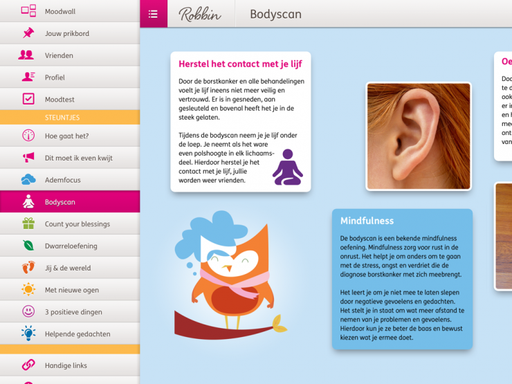 De app Robbin, gesymboliseerd door een roodborstje, toont op de startpagina direct de bekende ‘tools’ van psychosociale hulp. Met de moodmeter wordt de stemming gepeild. Op de moodwall vindt het lotgenotencontact plaats. De zelfhulpbestaat uit oefeningen ontleend aan de positieve psychologie (‘count your blessings’), cognitieve gedragspsychologie (‘helpende gedachten’ om negatieve gedachten uit te dagen) en mindfulness (‘bodyscan’ om contact met je lichaam te herstellen). Nuttige oefeningen waarmee de gebruikers dagelijks werken aan hun mentale weerbaarheid.*
