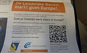 Ook in de klassieke personeelsadvertentie (de off line recruitment) zien we de laatste tijd pogingen om een brug te slaan tussen print en online. Niet alleen in krantenadvertentie’s (<<) maar ook op billboards (<<) staat een QR-code waarmee de werkzoekende direct op een wervingswebsite of misschien wel een YouTube-filmpje belandt over de functie waar hij of zij naar kan solliciteren.
