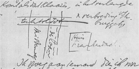 Of de inlichtingen van de gemeente over Frankendael Grönloh zullen hebben gerustgesteld, valt te betwijfelen. Anderhalf jaar later doopte hij zijn pen wederom in de inkt. ‘Ik vrees, dat U nog eens vlug zult moeten onderzoeken hoe het nu gaan zal met de buitenlaan van Frankendaal (buiten de sloot).’ Hij had naar de werkzaamheden staan kijken en ‘ondanks alle sussende berichten’ zag het er naar uit dat ‘de laan gekapt zal worden. De poortingang is al achteruit gezet, het bruggetje over de tochtsloot wordt verbreed & komt, als dat klaar is, in het verlengde van de laan.’ Aan iemand die hij ‘voor een opzichter hield’ vroeg hij of de bomen zouden worden gerooid. Deze zei: ‘“Een paar misschien.”’ Dat was voor hem ‘een antwoord in den bekenden trant. Het sloopen van een paar boomen heeft geen zin, er gaat dan minstens één van de twee rijen heelemaal eraan.’ Hij vreesde dat er ‘periculum in mora’28 was. Om de ernst van de situatie duidelijk te maken, maakte hij in zijn brief een schetsje, zoals hij die ook meermalen in zijn dagboek maakte.
