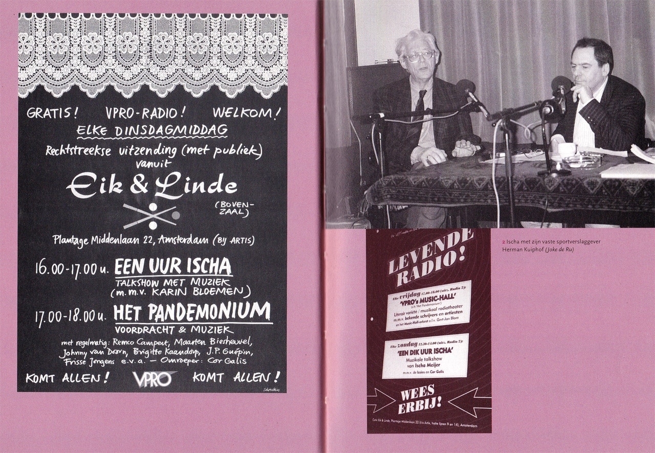 Volgens mij startte het programma ‘Het Pandomonium’ van VPRO-radio al voor 1984. Ik weet zeker dat ik er in de avond naar geluisterd heb. Toen was het nog niet om 17:00 in Eik en Linde. Wim Noordhoek zegt in bovenstaande radiouitzending na dat fantastische ANP Journaal met nog een melding voor de scheepvaart (NW 5): ‘Rechtstreeks uit het Theatercafé T D’. Ik kan echter niet reconstrueren op het web welke kroeg dat was in Amsterdam. Later werd het kennelijk de bovenzaal in Eik en Linde, na een uur Ischa.