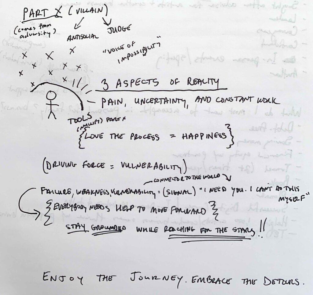 “Part X” verwijst naar het innerlijke obstakel dat je tegenhoudt om je volledige potentieel te bereiken. Het is je innerlijke criticus of saboteur. We zien een poppetje omringd door demonen: grote en kleine X-jes. Part X is de bron van negatieve gedachten, zelftwijfel, angst en destructief gedrag. Het is de stem in je hoofd die je vertelt dat je niet goed genoeg bent of dat je zult falen.
