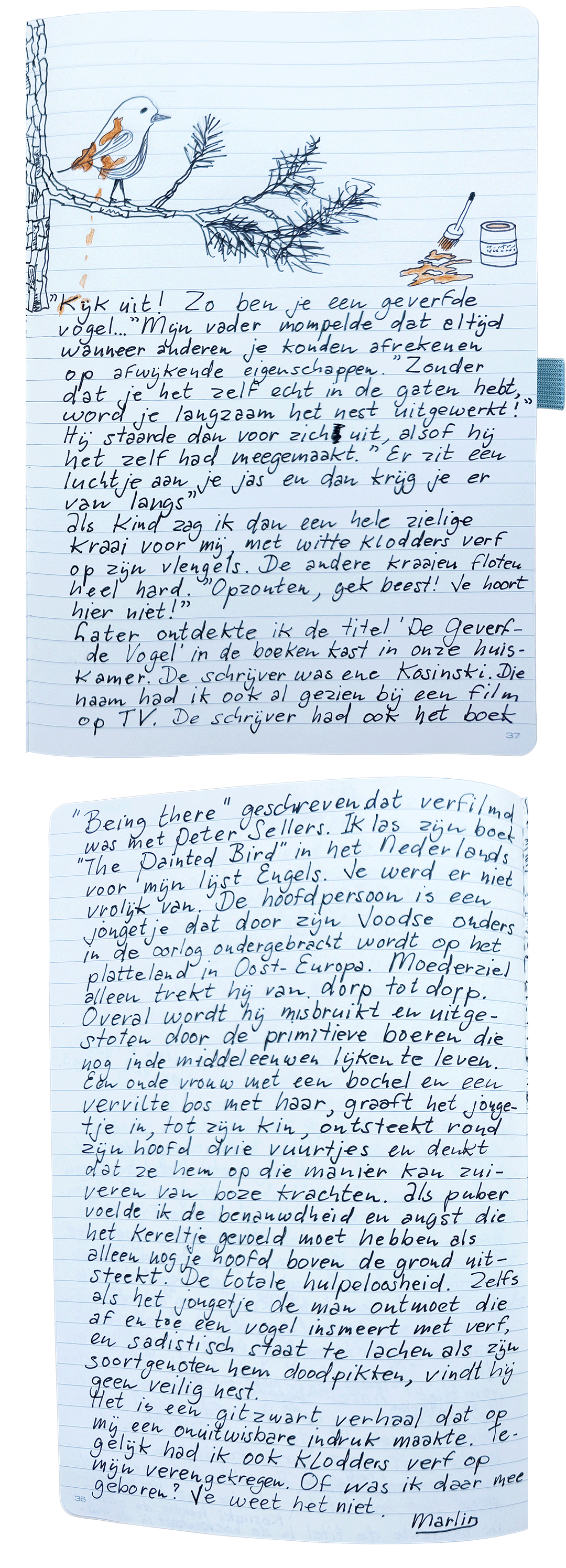 Met het verstrijken der jaren, inmiddels worstelend met het echte leven dat na het lezen van de boeken in je pubertijd met een keiharde realiteit zich aandoet, kreeg “De Geverfde Vogel” een nieuwe betekenis voor mij. Na mijn middelbare schooltijd verviel ik in een depressie die na het voltooien van mijn studie nog een keer terugkwam. De depressie werkte als klodders verf op mijn jas.